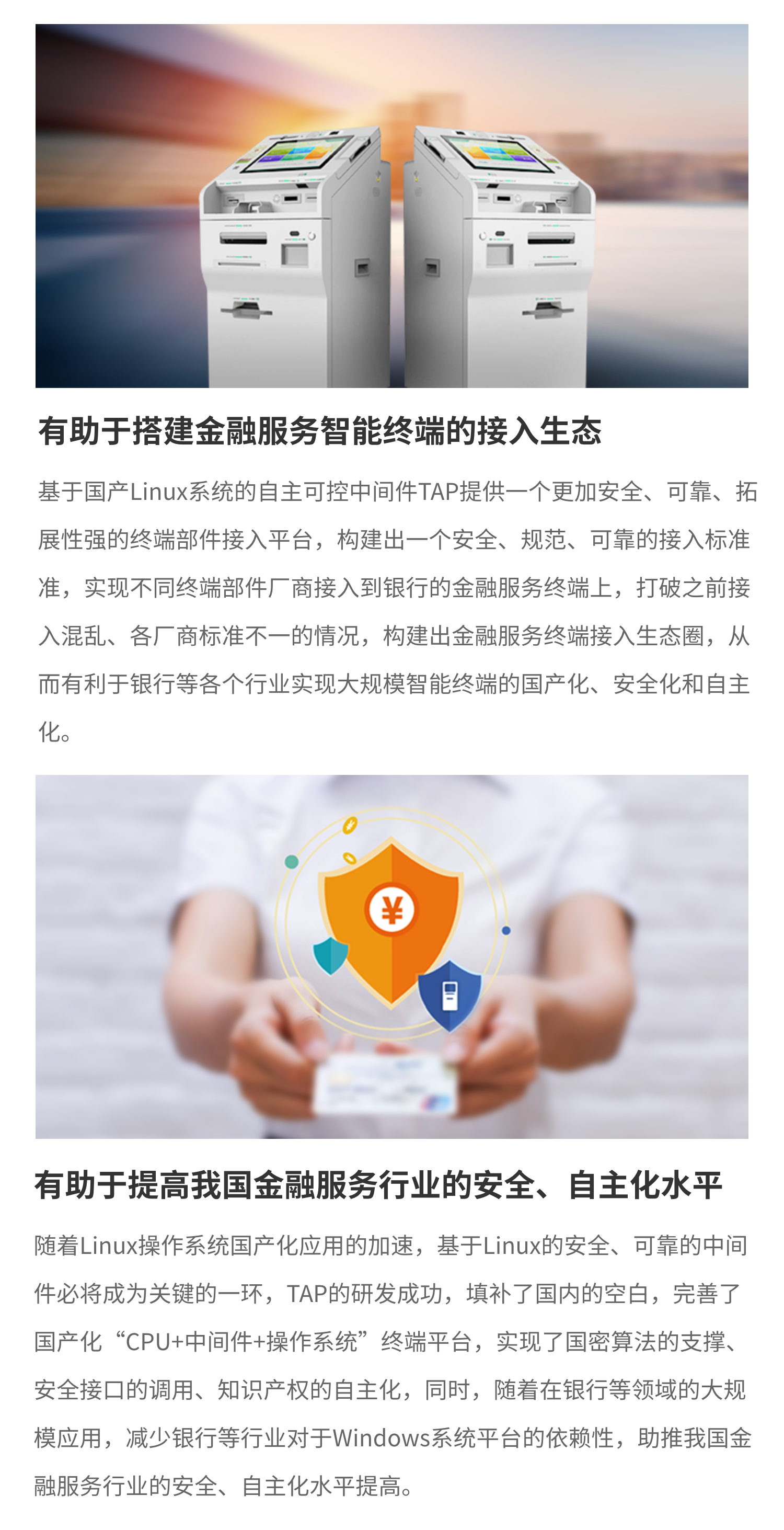 證通自主研發的面向金融領域的自主可控金融中間件平臺,是基于Linux下的XFS服務中間件一TAP,通過構建統一金融終端中間件平臺,實現接口的統一,從而讓金融機構更便捷的接入不同廠家不同型號的部件,同時,通過對國密等算法的支持,構建安全加密服務,保障信息存儲、傳輸的安全性,從而保證金融終端的穩定性、功能連續性、兼容性、靈活性、安全性,助力國產金融系統的安全、自主、可控。
