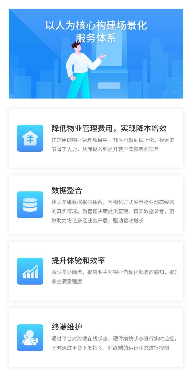 證通智慧物業解決方系統是公司為物業機構客戶提供的定制綜合一體化解決方案。通過與物業公司內部統一化管理系統進行對接,集成刷臉支付、微信、支付寶、銀行卡等多種繳費支付渠道,支持客戶使用人臉識別、身份證、指紋等進行身份確認,提供資產委托、影像信息記錄、證件打印、住戶信息管理、物業繳費、繳納記錄查詢、設備狀態監控、終端信息維護、人工客服,消息推送、房屋過戶、車位過戶、便民物資領借用,證明開具、文化宣傳、報表統計等全流程物業增值服務,讓數據多跑路,讓業主少跑路,實現物業費輕松繳、業主零等待、安全居住的物業服務,實現線上和線下的有效互動合作。