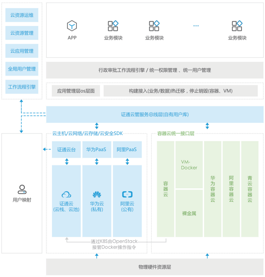 ????????證通多云/混合云平臺(tái)支持從裸金屬服務(wù)器開(kāi)始實(shí)現(xiàn)資源池快速構(gòu)建,集成管理各大云的平臺(tái)。通過(guò)一體化的管理平臺(tái)對(duì)資源池軟硬件等資源進(jìn)行統(tǒng)一地監(jiān)控、配置、部署和調(diào)度,以及進(jìn)行云服務(wù)管理相適應(yīng)的流程和權(quán)限管理等,為企業(yè)數(shù)據(jù)中心的云計(jì)算基礎(chǔ)架構(gòu)虛擬化與云業(yè)務(wù)運(yùn)營(yíng)提供解決方案。